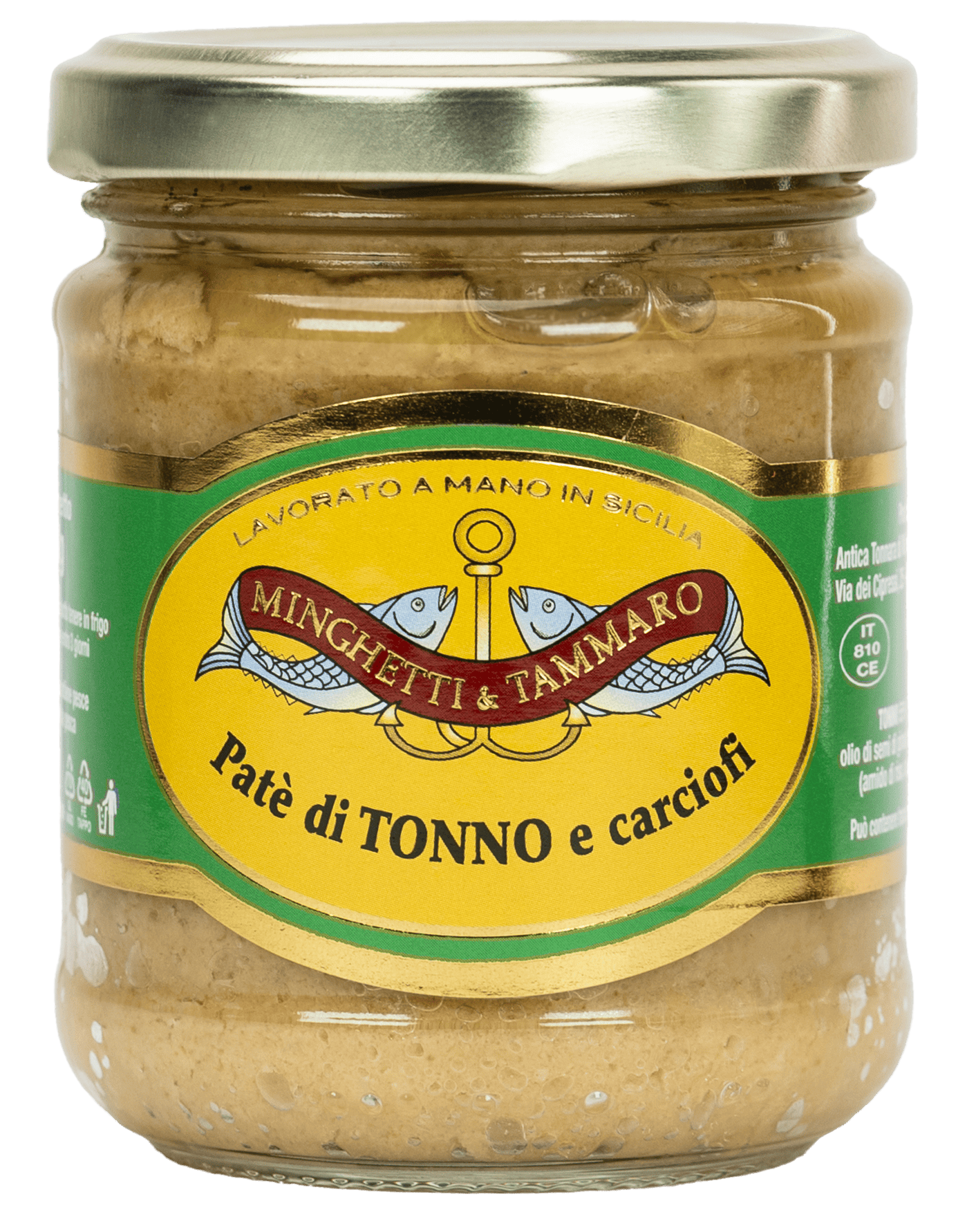 Découvrez le pâté de thon et artichauts en huile d’olive, un produit raffiné et savoureux qui combine le meilleur du thon (55%), des artichauts (20%) et de l’huile d’olive (20%), pour un goût unique. Ce pâté est fabriqué par l’Antica Tonnara di Minghetti & Tammaro S.R.L., située à Aspra/Bagheria (PA), en respectant les normes de sécurité alimentaire HACCP (CE 852/04 – 853/04).